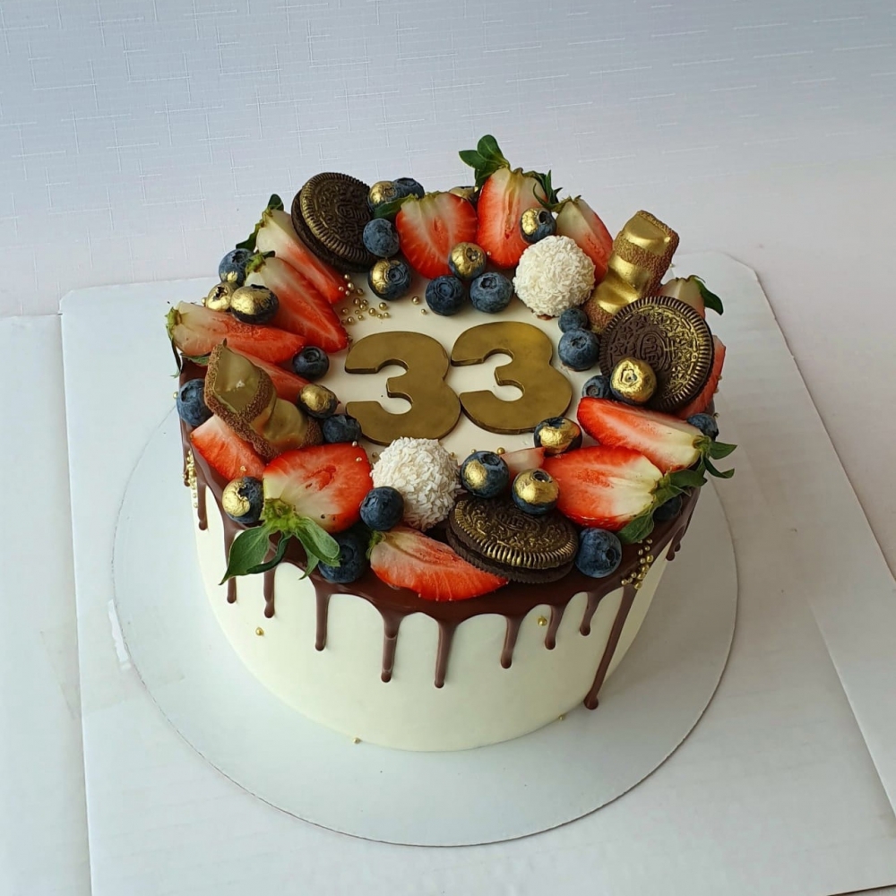 Ягодный торт с шоколадными подтеками на день рождения молодого человека.Посмотреть и выбрать начинку можно на этой странице.